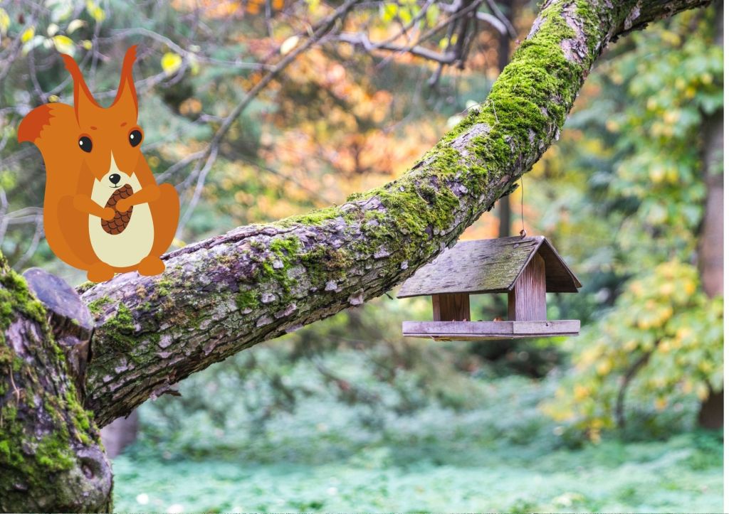 Just then they heard a rustling from the trees further down the garden.  The rustling continued and as they watched, it looked just like the leaves were moving around on their own!  Suddenly a little squirrel appeared, leaping along one of the tree branches.  It stood up on its hind legs, watching them, twirling a small nut around and around in its paws, as if it was deciding on the best spot to take its first bite.