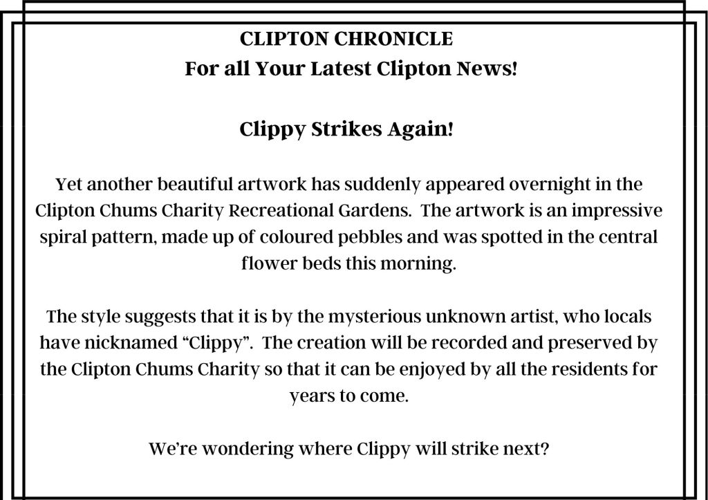 “Perhaps he should try to get that mystery artist to help him out,” contemplated Cookie, “you know, the one that keeps doing those pretty pebble designs in the park,” she added.