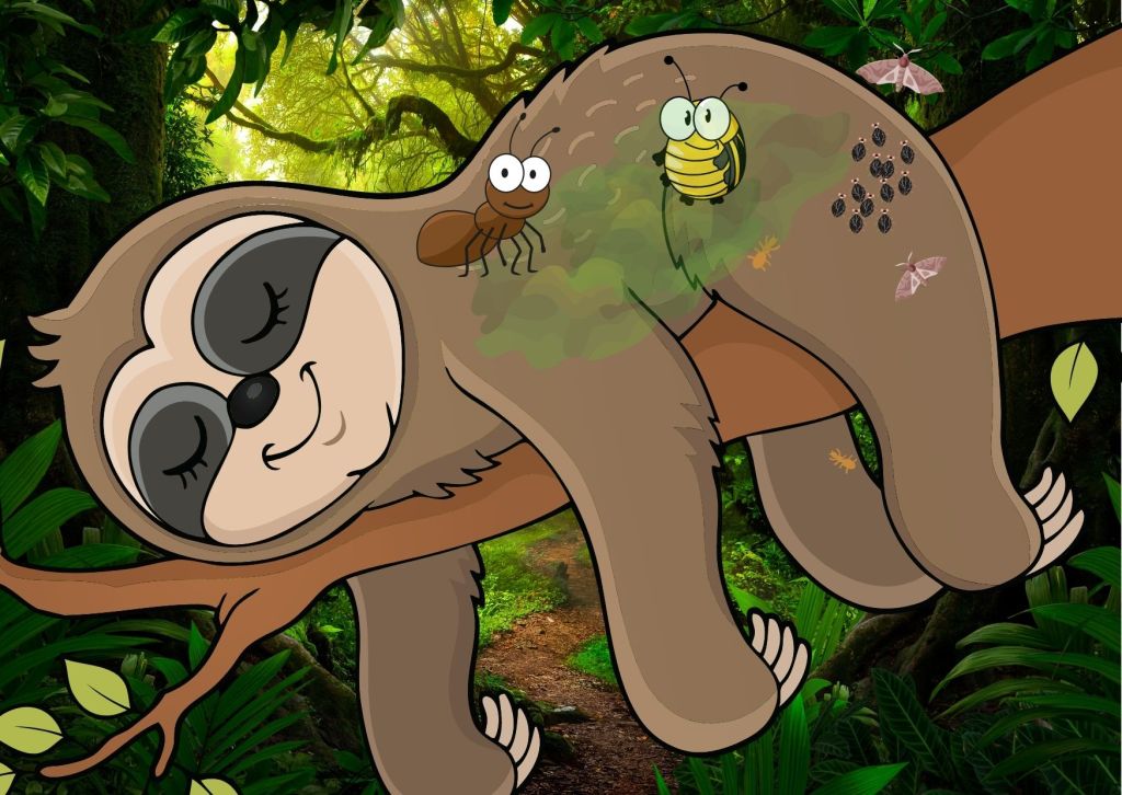 “Honestly! And there was me thinking ants were supposed to be smart!” tutted the bug. “Sloths – you know – hang upside down in the trees, very slow moving, sleep a lot, very laid back, have a wonderful coat full of critters like me!” the bug informed him, adding, “I’m Billy by the way.”