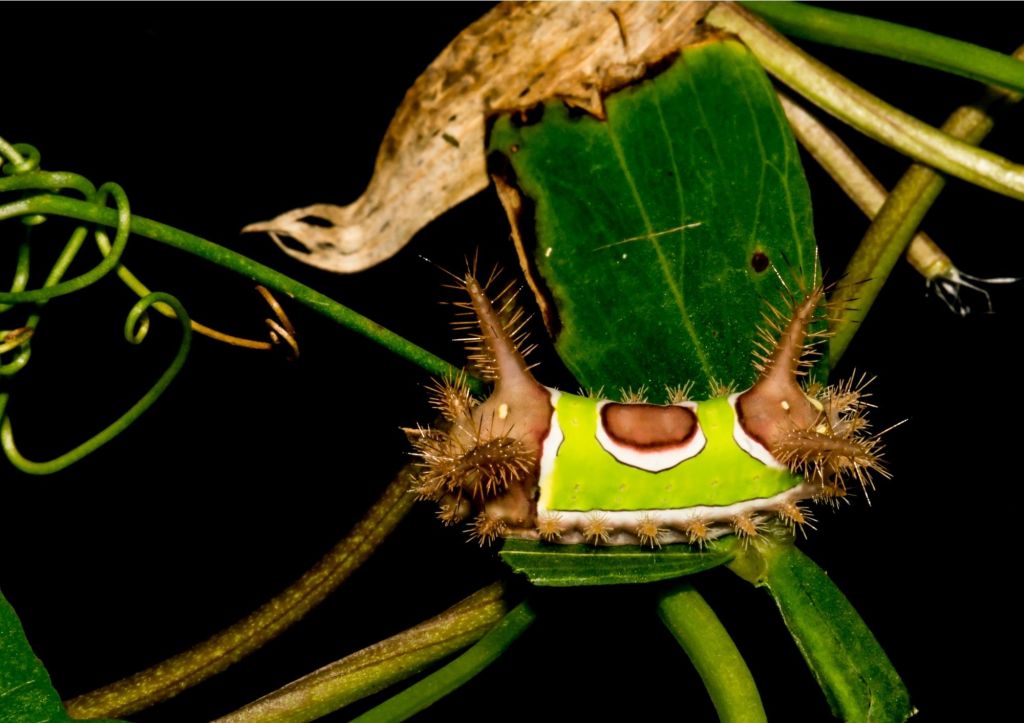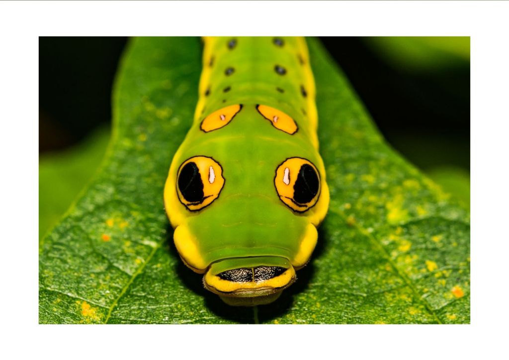 There are some weird and wonderful specimens out there; take, for example the saddleback caterpillar, that sports a pair of horns and bristles with venomous hairs; or there’s the flannel moth caterpillar, which for all the world looks just like a toupee (but don’t be tempted to try it on because those hairs are poisonous); then there’s the spicebush swallowtail caterpillar that looks just like a little snake – it has markings that mimic a snake’s head, with eyes and a mouth! Whilst you might be thinking that these guys would only give a fright to a bird or lizard – think again – the giant silk worm caterpillar is so poisonous that it can kill a human being! So, these guys sure mean business!