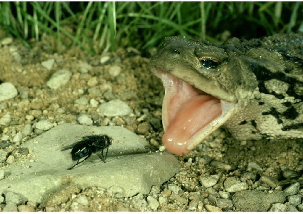 So apart from their own skin (!) what else do toads like to munch on? Insects are a main feature on their menu, but they will also eat other reptiles and even small mammals – they have a sticky tongue, which helps them to reach out and catch their dinner, which as they have no teeth, they swallow whole!