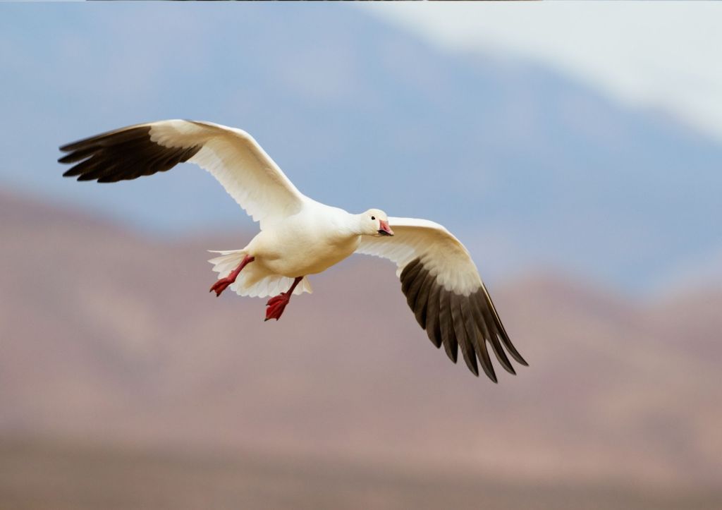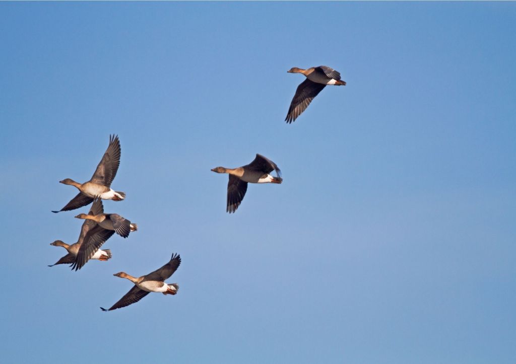 One of the most incredible geese migrations is performed by the Bar-Headed goose, which manages to fly across the Himalayas reaching altitudes of up to 7,000 m (an unbelievable 4 miles high) (where oxygen is scarce) and achieving a total journey length of up to 5,000 km (an amazing 3,000 miles) – that’s really reaching new heights! It’s just as well that geese are strong flyers and can achieve speeds of up to 40mph (64 kph).
