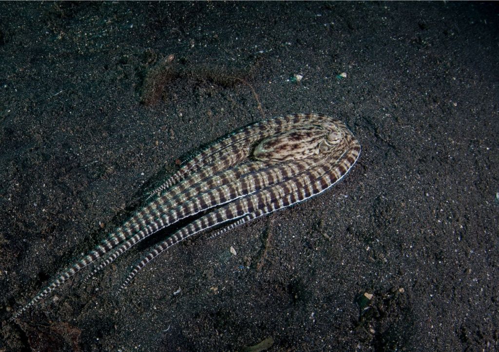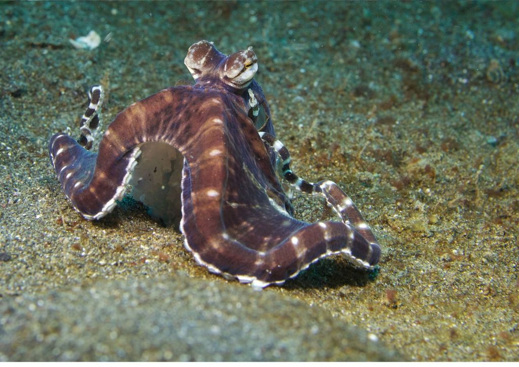 It can also impersonate a lion fish (holding out its tentacles to resemble the deadly spines), a jelly fish (trailing its tentacles out behind it) and a flat fish, burying itself in the sand to keep out of harm’s way. This unbelievable behaviour can help it to put off predators, capture prey and convince others its best left off the dinner menu!