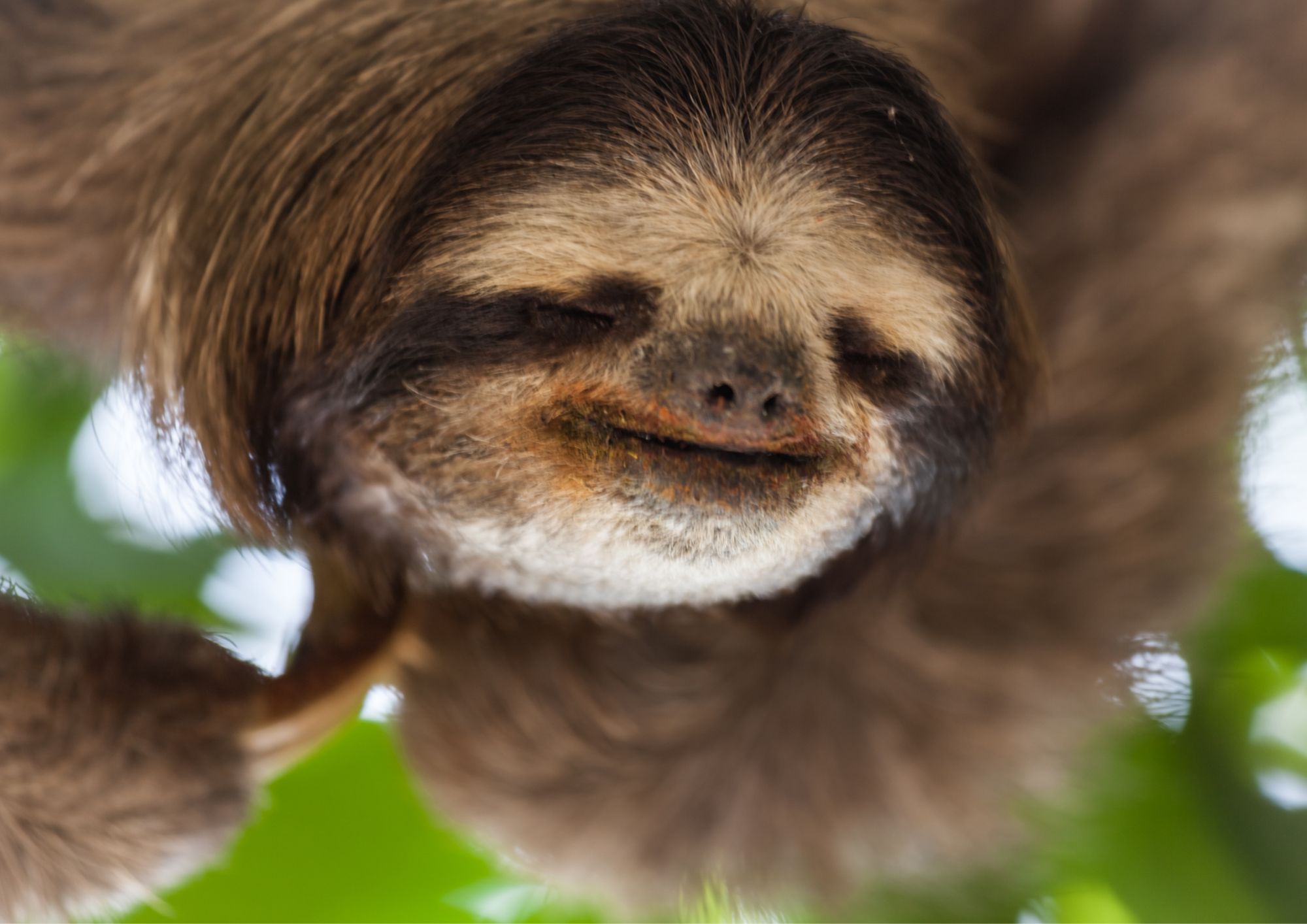 If you think of a laid-back animal, the first one that comes to mind is the sloth – sloths are definitely not hurrying for anyone – they’re just hanging around in the trees, taking things real slow. Whilst they’re not ones for hitting the gym, all that hanging about means they have incredibly strong muscles to support their being upside down all day (and night) long. They have poor, monochrome eyesight, which is one good reason why they wouldn’t be able to move around at apace and whilst they might look like they’re on their own, they do in fact have a fur full of company– up to 1000 insects and algae call a sloth home – all the action is at fur-level!
