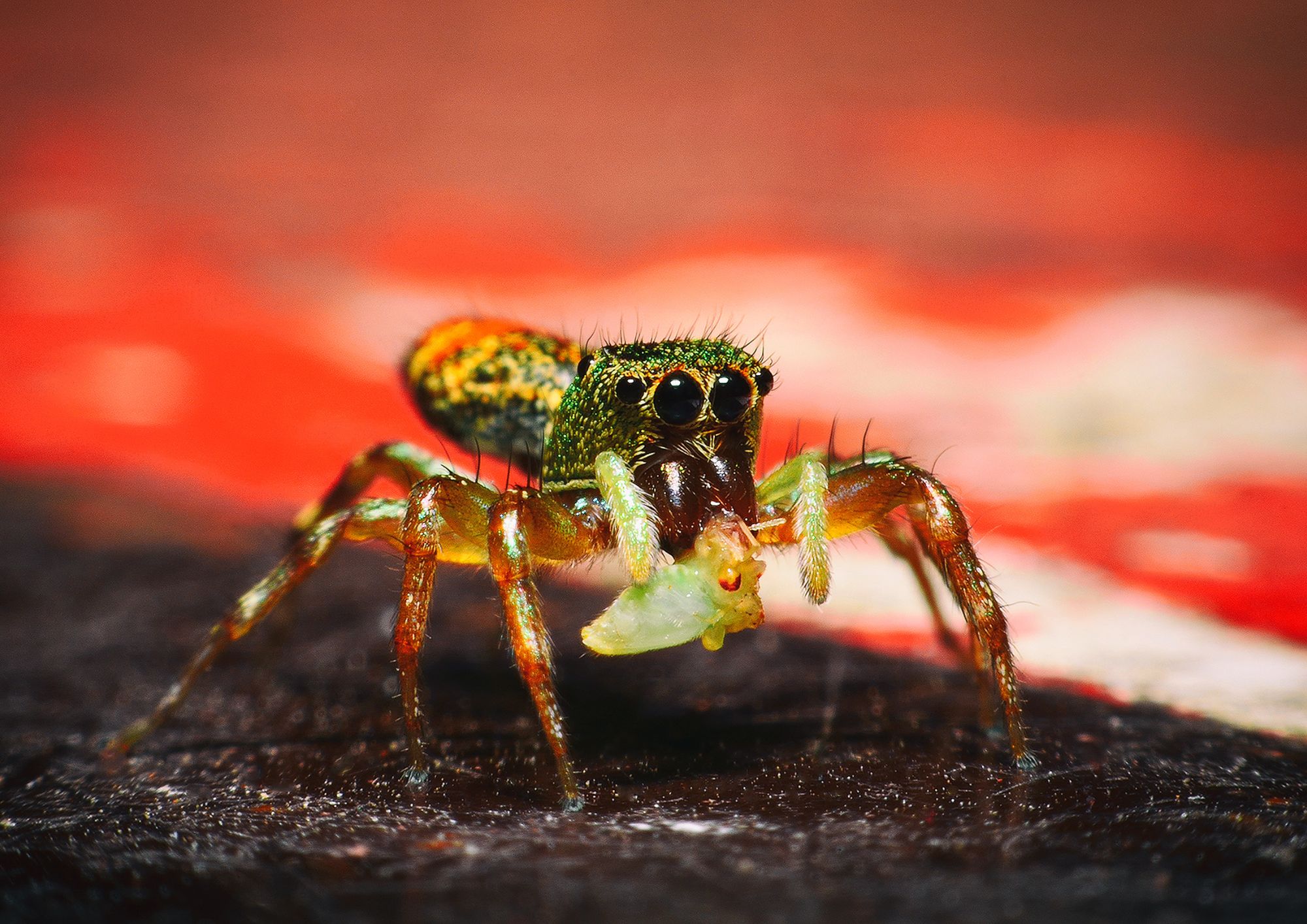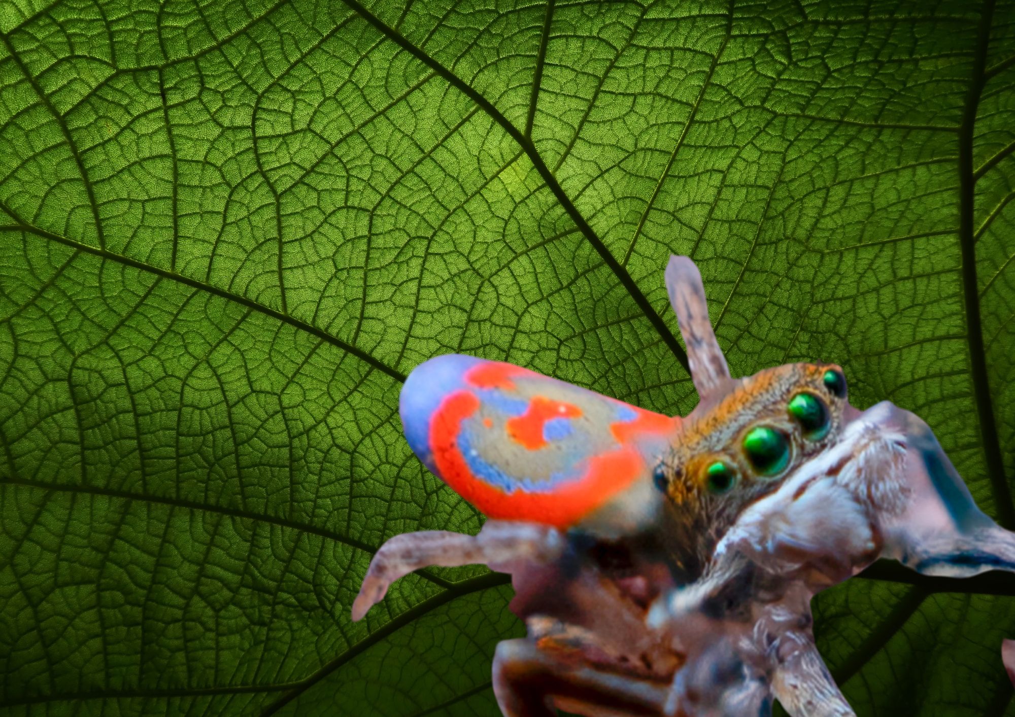 What do you do when you want to attract a female, but not end up as her dinner? The answer is to impress her with a spectacularly vibrant display of shimmying and shaking and that’s exactly what the tiny peacock spider does. It goes like this: he raises his third pair of legs (which have little white socks on them) and waves enticingly to his intended; if she doesn’t look too interested, he will aim to gain her attention by raising his strikingly showy abdomen in the air and quivering it delightfully in her direction – maybe she’s mesmerised by the rainbow of colours; maybe she’s hypnotised by the rhythmic waving of his myriad of hues but if he’s lucky, she might come over for a closer look..he’d better have practiced his speedy side step though, just in case she really is feeling a little more peckish than passionate!