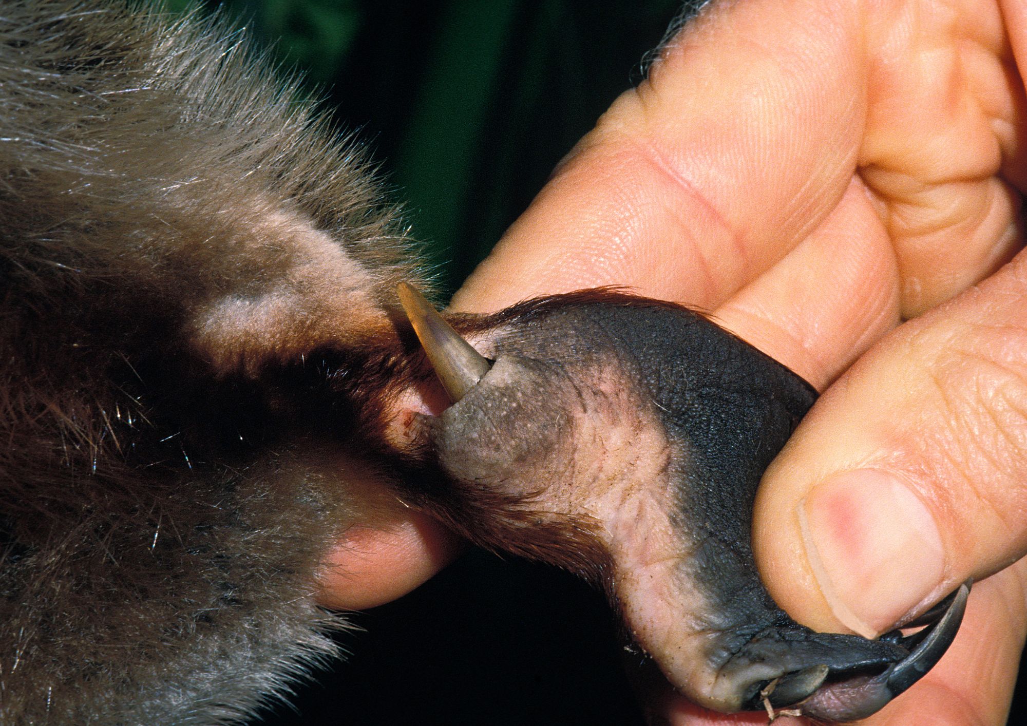 Getting a grip with lengthy claws helps you to hang on in there and the three toed sloth certainly has a good set of nails to support its upside-down lifestyle.  These 10cm (4in) specimens are, in fact, bone extensions, honed to sharp perfection to provide that ultimate toehold in the tree tops.